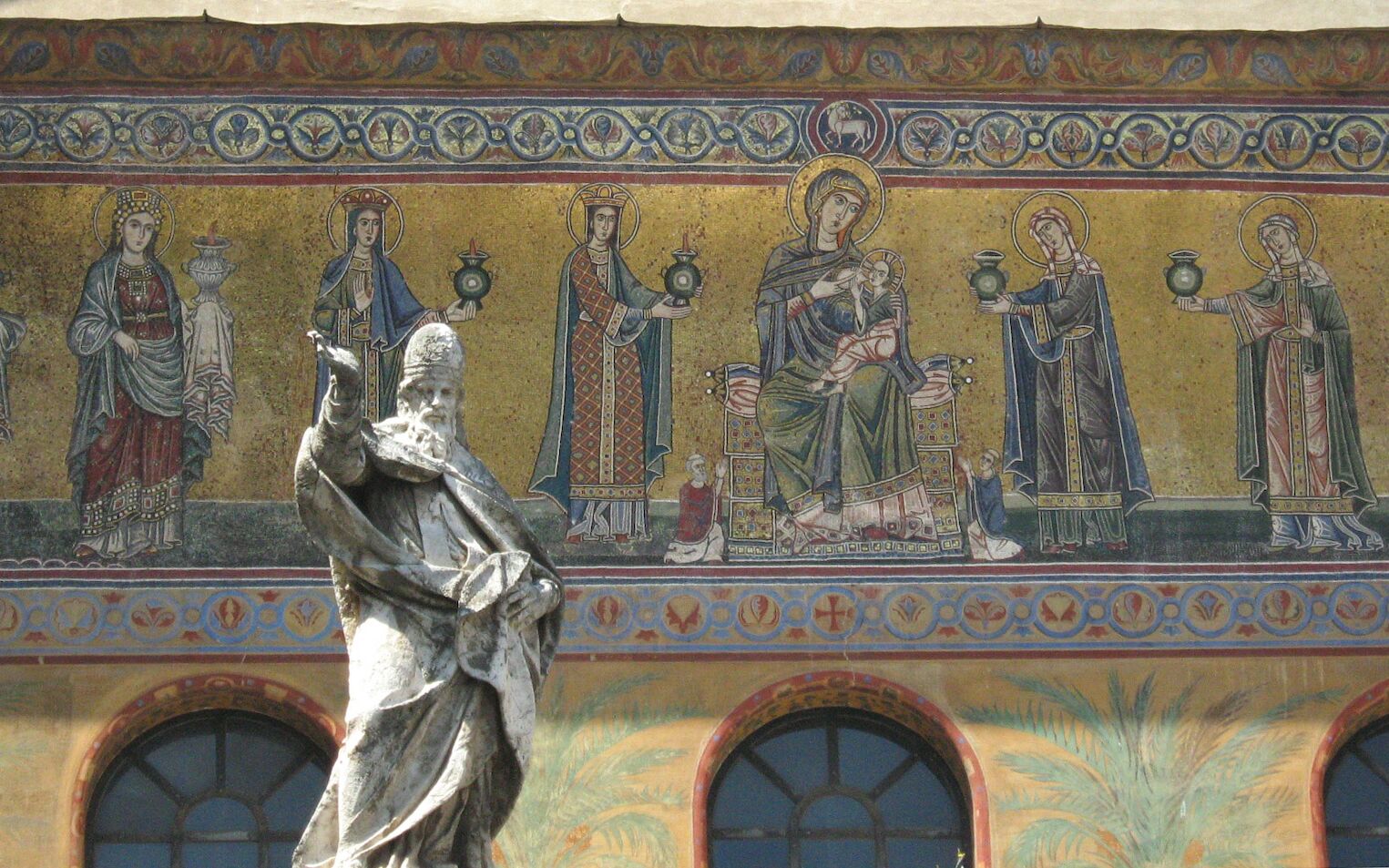 Journée à la découverte des églises. Départ vers le quartier du Trastevere pour découvrir la basilique Sainte-Cécile, érigée au ve siècle et dédiée à la sainte dont elle abrite les reliques. Ses remarquables fresques, réalisées par Pietro Cavallini, précurseur de la Renaissance italienne, rompent avec le style byzantin traditionnel et offrent un témoignage unique de l’art médiéval romain. Continuation vers la basilique Sainte-Marie-du-Trastevere, au charme médiéval, dont la façade et l’intérieur sont magnifiquement ornés de mosaïques byzantines. Poursuite vers le quartier du Celio et la basilique Saint-Clément, l’une des plus anciennes de Rome, qui illustre l’évolution religieuse, artistique et urbaine de la ville, mêlant christianisme primitif, influences byzantines et héritage antique. Le parcours se poursuit à Santa Maria in Dominica, fondée au ive siècle et reconstruite au ixe siècle, remarquable pour ses mosaïques byzantines et son architecture basilicale classique, et se termine à la basilique Sainte-Praxède, célèbre pour ses exceptionnelles mosaïques dans l’abside et le chœur.