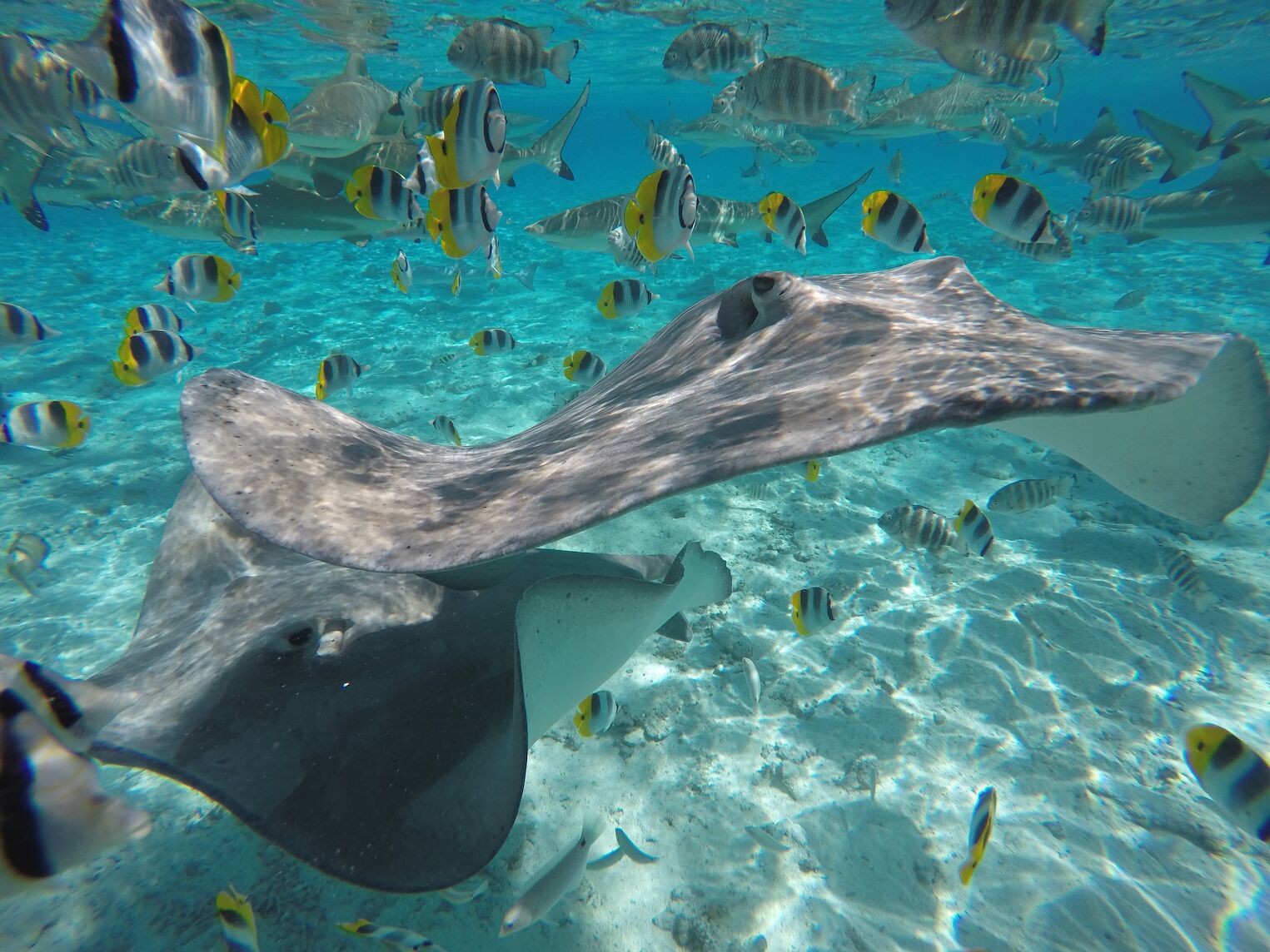 Visite en bateau des plus belles baies de Moorea : la baie de Cook suivie de la baie d’Opunohu. Ensuite le bateau jette l’ancre sur un magnifique banc de sable doré où la mer bleu turquoise n’a qu’un mètre de profondeur. Avant même la baignade, les raies sont là. Inutile de savoir nager pour danser avec les pastenagues en liberté. Elles enveloppent les visiteurs affectueusement de leurs ailes majestueuses et inoffensives. Observation également des requins à pointe noir. Après ce ballet, la navigation se poursuit. Arrêt sur le motu pour un déjeuner barbecue et animations culturelles. Préparation du poisson cru à la tahitienne suivie de la dégustation du buffet local (poisson cru, poisson et poulet mariné et grillé, salade de riz, poe et fruit frais. Enfin, courte leçon de danses tahitiennes. Dîner à l’hôtel.